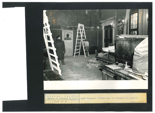 Ateneo Veneto Lavori di restauro 1956-57: foto n° 41: Sala Tommaseo - Prima fase di distacco dei quadri.