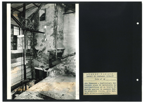 Ateneo Veneto Lavori di restauro 1956-57: foto n° 46: Ala Tommaseo - Particolare del vecchio piano di sottotetto in corrispondenza ad un tratto di gronda appreso in passato dalla proprietà vicina, allo spigolo oriente-mezzogiorno.
