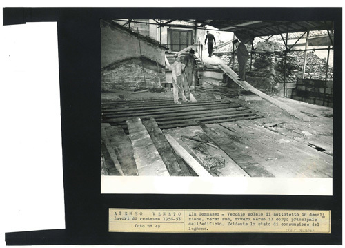 Ateneo Veneto Lavori di restauro 1956-57: foto n° 49: Ala Tommaseo - Vecchio solaio di sottotetto in demolizione, verso su, ovvero verso il corpo principale delledificio. Evidente lo stato di consunzione del legname.