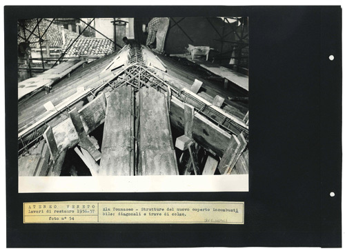 Ateneo Veneto Lavori di restauro 1956-57: foto n° 54: Ala Tommaseo - Strutture del nuovo coperto incombustibile: diagonali e trave di colmo.