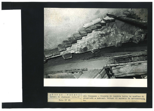 Ateneo Veneto Lavori di restauro 1956-57: foto n° 55: Ala Tommaseo - Traccie di vecchio tetto in confine di proprietà a sud-est. Notasi il cordolo in sottomurazione.