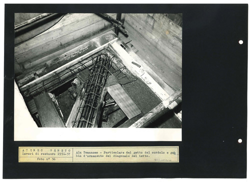 Ateneo Veneto Lavori di restauro 1956-57: foto n° 56: Ala Tommaseo - Particolare del getto del cordolo e gabbia darmamento del diagonale del tetto.