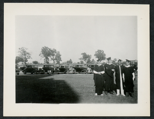 Pier Maria Pasinetti con tocco e toga e alcuni colleghi