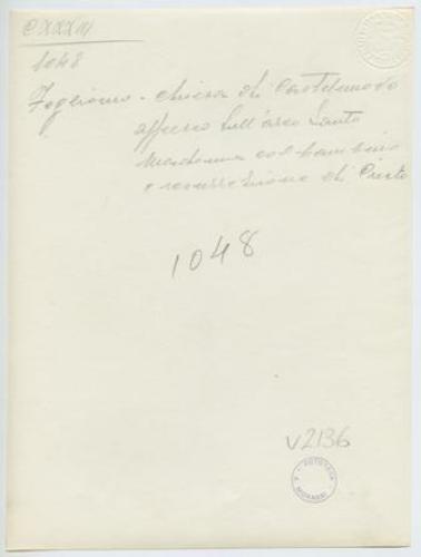 - ISCRIZIONI supporto primario: verso: in basso - Fogliano - chiesa di Castelnuovo/ affresco sull'arco Santo/ madonna col bambino/ e resurrezione di Cristo - a matita -