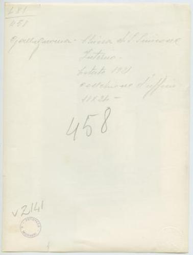 - ISCRIZIONI supporto primario: verso: in alto al centro - Gallignana - Chiesa di S. Simione/ Interno/ Estate 1921/ collezione d'ufficio/ 18x24 - a matita -