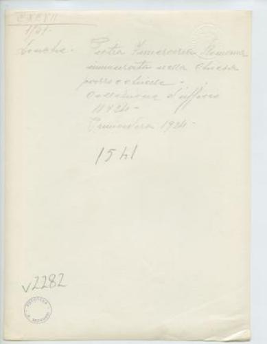 - ISCRIZIONI supporto primario: verso: in alto al centro - Lonche - Pietra Funeraria Romana/ immurata nella Chiesa/ parrocchiale./ Collezione d'ufficio/ 18x24/ Primavera 1924 - a matita -