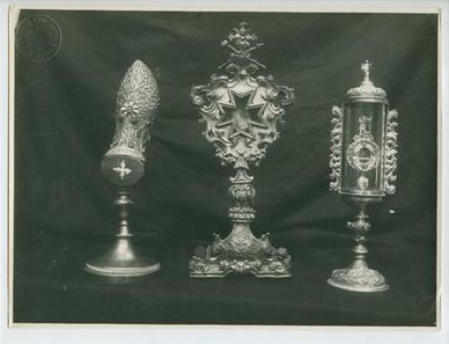 Lussingrande - Chiesa parrocchiale: due ostensori e reliquario (scarpa di Sant'Elena). Estate 1923.