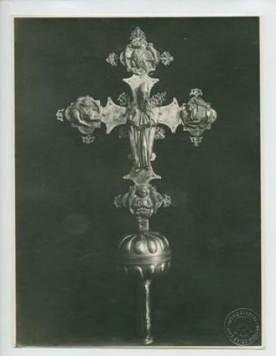 Ossero - Duomo: croce astile in argento sbalzato con la figura di San Nicolò e i simboli degli evangelisti. Sec. XVI. Estate 1923.