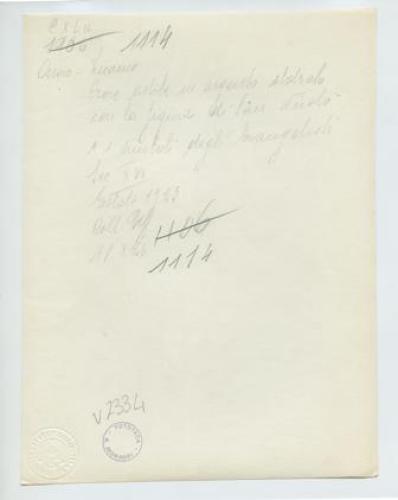 - ISCRIZIONI supporto primario: verso: in alto al centro - Ossero - Duomo/ Croce astile in argento sbalzato/ con la figura di San Nicolò/ e i simboli degli evangelisti/ Sec. XVI/ Estate 1923/ Coll. Uff/ 18x24 - a matita -
