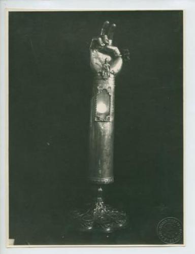 Ossero - Duomo: Tesoro, reliquiario con braccio e mano in argento dorato. Estate 1923.