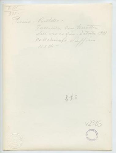 - NOTIZIE STORICO CRITICHE La fotografia fa parte dell'insieme archivistico denominato "Venezia Giulia" (tre cartelle: V. VIII, V. IX, V. X), nello specifico, è conservata all'interno della cartella V. IX. E' stata realizzata nell'estate 1921 da Pietro Opiglia, che dal 1908 al 1947, svolse il ruolo di fotografo presso il Museo Civico triestino e del quale si serviva l'Ufficio Belle Arti della Venezia Giulia durante le proprie campagne fotografiche. In questo caso, l'Ufficio Belle Arti aveva promosso una campagna ricognitiva circa le opere d'arte presenti sul territorio transfrontaliero che oggi comprende il Friuli Venezia Giulia, la Croazia e la Slovenia. Si ricorda, inoltre, che Antonio Morassi svolse il ruolo di funzionario sovrintendente presso l'Ufficio Belle Arti della Venezia Giulia dal 1920 al 1925.