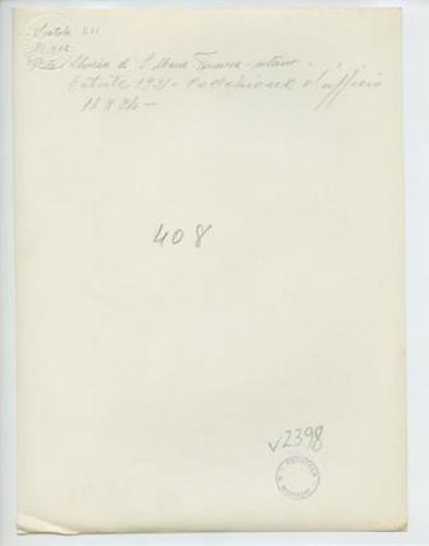 - NOTIZIE STORICO CRITICHE La fotografia fa parte dell'insieme archivistico denominato "Venezia Giulia" (tre cartelle: V. VIII, V. IX, V. X), nello specifico, è conservata all'interno della cartella V. IX. E' stata realizzata nell'estate 1921 da Pietro Opiglia, che dal 1908 al 1947, svolse il ruolo di fotografo presso il Museo Civico triestino e del quale si serviva l'Ufficio Belle Arti della Venezia Giulia durante le proprie campagne fotografiche. In questo caso, l'Ufficio Belle Arti aveva promosso una campagna ricognitiva circa le opere d'arte presenti sul territorio transfrontaliero che oggi comprende il Friuli Venezia Giulia, la Croazia e la Slovenia. Si ricorda, inoltre, che Antonio Morassi svolse il ruolo di funzionario sovrintendente presso l'Ufficio Belle Arti della Venezia Giulia dal 1920 al 1925.