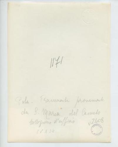 - ISCRIZIONI supporto primario: verso: in alto al centro - Pola - Frammenti provenienti/ da S. Maria del Canneto/ collezione d'ufficio/ 18x24 - a matita -