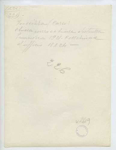 - ISCRIZIONI supporto primario: verso: a sinistra - Voissizza (Carso)/ chiesa parrocchiale distrutta/ Primavera 1921. collezione/ d'ufficio 18x24 - a matita -