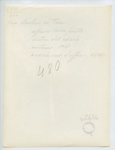 - ISCRIZIONI supporto primario: verso: in alto al centro - S. Martino di Terzo/ affresco sulla parete/ destra dell'abside/ autunno 1921/ Collezione d'ufficio 18x24 - a matita -