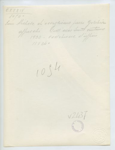 - ISCRIZIONI supporto primario: verso: a destra - San Michele di Ossegliano presso Gorizia/ affreschi sull'arco Santo autunno/ 1922. collezione d'ufficio/ 18x24 - a matita -