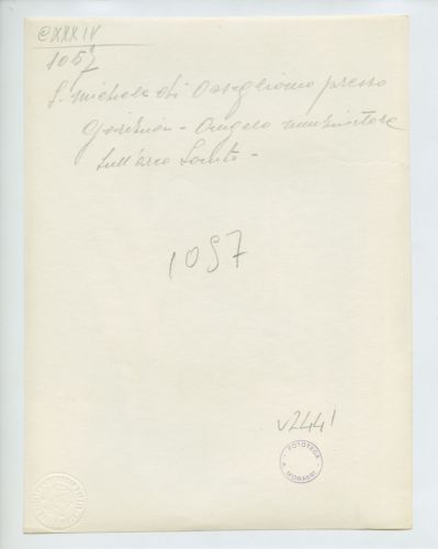 - ISCRIZIONI supporto primario: verso: in alto al centro - San Michele di Ossegliano presso/ Gorizia. Angelo nunziatore/ sull'arco Santo - a matita -
