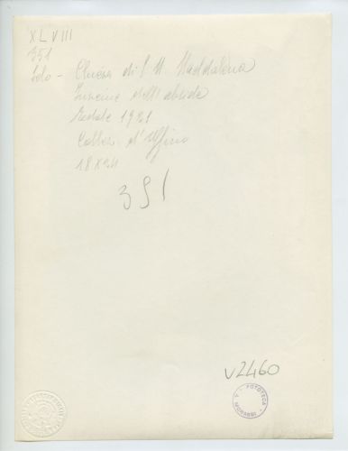 - ISCRIZIONI supporto primario: verso: in alto al centro - Selo - Chiesa di S.M. Maddalena/ Insieme dell'abside/ Estate 1921/ Collez. d'ufficio/ 18x24 - a matita -