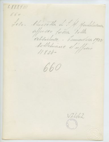- ISCRIZIONI supporto primario: verso: in alto al centro - Selo - Chiesetta di S.M. Maddalena/ affresco sulla volta/ absidale. Primavera 1922/ collezione d'ufficio/ 18x24 - a matita -