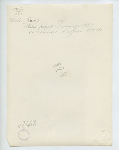 - NOTIZIE STORICO CRITICHE La fotografia fa parte dell'insieme archivistico denominato "Venezia Giulia" (tre cartelle: V. VIII, V. IX, V. X), nello specifico, è conservata all'interno della cartella V. IX. E' stata realizzata nella primavera 1921 da Pietro Opiglia, che dal 1908 al 1947, svolse il ruolo di fotografo presso il Museo Civico triestino e del quale si serviva l'Ufficio Belle Arti della Venezia Giulia durante le proprie campagne fotografiche. In questo caso, l'Ufficio Belle Arti aveva promosso una campagna ricognitiva circa le opere d'arte presenti sul territorio transfrontaliero che oggi comprende il Friuli Venezia Giulia, la Croazia e la Slovenia. Si ricorda, inoltre, che Antonio Morassi svolse il ruolo di funzionario sovrintendente presso l'Ufficio Belle Arti della Venezia Giulia dal 1920 al 1925.