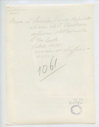 - NOTIZIE STORICO CRITICHE La fotografia fa parte dell'insieme archivistico denominato "Venezia Giulia" (tre cartelle: V. VIII, V. IX, V. X), nello specifico, è conservata all'interno della cartella V. IX. E' stata realizzata nell'estate 1922 da Pietro Opiglia, che dal 1908 al 1947, svolse il ruolo di fotografo presso il Museo Civico triestino e del quale si serviva l'Ufficio Belle Arti della Venezia Giulia durante le proprie campagne fotografiche. In questo caso, l'Ufficio Belle Arti aveva promosso una campagna ricognitiva circa le opere d'arte presenti sul territorio transfrontaliero che oggi comprende il Friuli Venezia Giulia, la Croazia e la Slovenia. Si ricorda, inoltre, che Antonio Morassi svolse il ruolo di funzionario sovrintendente presso l'Ufficio Belle Arti della Venezia Giulia dal 1920 al 1925.