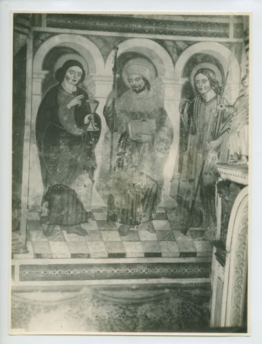 - ISCRIZIONI supporto primario: verso: in alto al centro - Svino di Susida presso Caporetto/ Chiesa di S. Andrea/ affresco dell'abside/ Tre Santi/ Estate 1922/ Collezione d'ufficio/ 18x24 - a matita -