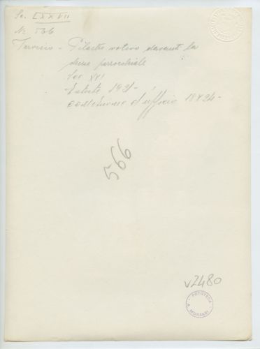 - NOTIZIE STORICO CRITICHE La fotografia fa parte dell'insieme archivistico denominato "Venezia Giulia" (tre cartelle: V. VIII, V. IX, V. X), nello specifico, è conservata all'interno della cartella V. IX. E' stata realizzata nell'estate 1921 da Pietro Opiglia, che dal 1908 al 1947, svolse il ruolo di fotografo presso il Museo Civico triestino e del quale si serviva l'Ufficio Belle Arti della Venezia Giulia durante le proprie campagne fotografiche. In questo caso, l'Ufficio Belle Arti aveva promosso una campagna ricognitiva circa le opere d'arte presenti sul territorio transfrontaliero che oggi comprende il Friuli Venezia Giulia, la Croazia e la Slovenia. Si ricorda, inoltre, che Antonio Morassi svolse il ruolo di funzionario sovrintendente presso l'Ufficio Belle Arti della Venezia Giulia dal 1920 al 1925.