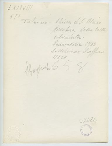 - ISCRIZIONI supporto primario: verso: in alto al centro - Tolmino - Chiesa di S. Ulrico/ Nervatura della volta/ absidale/ Collezione d'ufficio/ 18x24 - a matita -