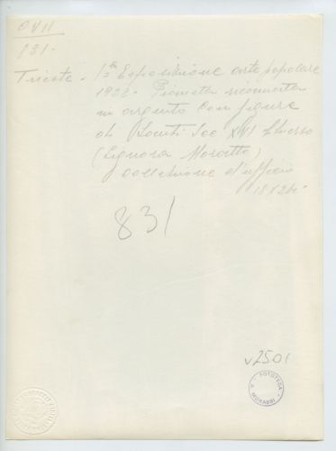 - NOTIZIE STORICO CRITICHE La fotografia fa parte dell'insieme archivistico denominato "Venezia Giulia" (tre cartelle: V. VIII, V. IX, V. X), nello specifico, è conservata all'interno della cartella V. IX. E' stata realizzata nel 1922 da Pietro Opiglia, che dal 1908 al 1947, svolse il ruolo di fotografo presso il Museo Civico triestino e del quale si serviva l'Ufficio Belle Arti della Venezia Giulia durante le proprie campagne fotografiche. In questo caso, l'Ufficio Belle Arti aveva promosso una campagna ricognitiva circa le opere d'arte presenti sul territorio transfrontaliero che oggi comprende il Friuli Venezia Giulia, la Croazia e la Slovenia. Antonio Morassi svolse il ruolo di funzionario sovrintendente presso l'Ufficio Belle Arti della Venezia Giulia dal 1920 al 1925. La fotografia fa parte di una serie realizzata durante la Prima mostra d'arte popolare italiana, che si tenne a Trieste nel 1922.