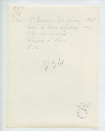 - ISCRIZIONI supporto primario: verso: in alto al centro - Trieste - I Esposizione arte popolare. 1922/ Scatola in legno con/ gallo sul coperchio/ Collezione d'ufficio/ 18x24 - a matita -