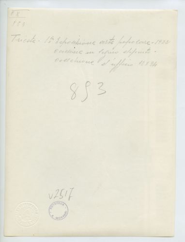 - NOTIZIE STORICO CRITICHE La fotografia fa parte dell'insieme archivistico denominato "Venezia Giulia" (tre cartelle: V. VIII, V. IX, V. X), nello specifico, è conservata all'interno della cartella V. IX. E' stata realizzata nel 1922 da Pietro Opiglia, che dal 1908 al 1947, svolse il ruolo di fotografo presso il Museo Civico triestino e del quale si serviva l'Ufficio Belle Arti della Venezia Giulia durante le proprie campagne fotografiche. In questo caso, l'Ufficio Belle Arti aveva promosso una campagna ricognitiva circa le opere d'arte presenti sul territorio transfrontaliero che oggi comprende il Friuli Venezia Giulia, la Croazia e la Slovenia. Antonio Morassi svolse il ruolo di funzionario sovrintendente presso l'Ufficio Belle Arti della Venezia Giulia dal 1920 al 1925. La fotografia fa parte di una serie realizzata durante la Prima mostra d'arte popolare italiana, che si tenne a Trieste nel 1922.