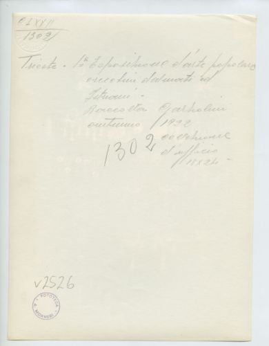 - NOTIZIE STORICO CRITICHE La fotografia fa parte dell'insieme archivistico denominato "Venezia Giulia" (tre cartelle: V. VIII, V. IX, V. X), nello specifico, è conservata all'interno della cartella V. IX. E' stata realizzata nel 1922 da Pietro Opiglia, che dal 1908 al 1947, svolse il ruolo di fotografo presso il Museo Civico triestino e del quale si serviva l'Ufficio Belle Arti della Venezia Giulia durante le proprie campagne fotografiche. In questo caso, l'Ufficio Belle Arti aveva promosso una campagna ricognitiva circa le opere d'arte presenti sul territorio transfrontaliero che oggi comprende il Friuli Venezia Giulia, la Croazia e la Slovenia. Antonio Morassi svolse il ruolo di funzionario sovrintendente presso l'Ufficio Belle Arti della Venezia Giulia dal 1920 al 1925. La fotografia fa parte di una serie realizzata durante la Prima mostra d'arte popolare italiana, che si tenne a Trieste nel 1922.