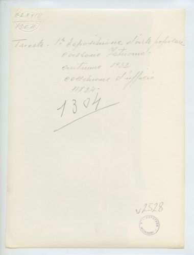 - NOTIZIE STORICO CRITICHE La fotografia fa parte dell'insieme archivistico denominato "Venezia Giulia" (tre cartelle: V. VIII, V. IX, V. X), nello specifico, è conservata all'interno della cartella V. IX. E' stata realizzata nel 1922 da Pietro Opiglia, che dal 1908 al 1947, svolse il ruolo di fotografo presso il Museo Civico triestino e del quale si serviva l'Ufficio Belle Arti della Venezia Giulia durante le proprie campagne fotografiche. In questo caso, l'Ufficio Belle Arti aveva promosso una campagna ricognitiva circa le opere d'arte presenti sul territorio transfrontaliero che oggi comprende il Friuli Venezia Giulia, la Croazia e la Slovenia. Antonio Morassi svolse il ruolo di funzionario sovrintendente presso l'Ufficio Belle Arti della Venezia Giulia dal 1920 al 1925. La fotografia fa parte di una serie realizzata durante la Prima mostra d'arte popolare italiana, che si tenne a Trieste nel 1922.