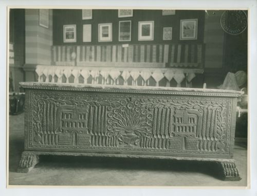 Trieste - I Esposizione d'arte popolare: cassone intagliato della Liburnia. Autunno 1922.