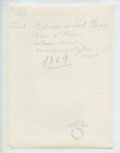 - NOTIZIE STORICO CRITICHE La fotografia fa parte dell'insieme archivistico denominato "Venezia Giulia" (tre cartelle: V. VIII, V. IX, V. X), nello specifico, è conservata all'interno della cartella V. IX. E' stata realizzata nel 1922 da Pietro Opiglia, che dal 1908 al 1947, svolse il ruolo di fotografo presso il Museo Civico triestino e del quale si serviva l'Ufficio Belle Arti della Venezia Giulia durante le proprie campagne fotografiche. In questo caso, l'Ufficio Belle Arti aveva promosso una campagna ricognitiva circa le opere d'arte presenti sul territorio transfrontaliero che oggi comprende il Friuli Venezia Giulia, la Croazia e la Slovenia. Antonio Morassi svolse il ruolo di funzionario sovrintendente presso l'Ufficio Belle Arti della Venezia Giulia dal 1920 al 1925. La fotografia fa parte di una serie realizzata durante la Prima mostra d'arte popolare italiana, che si tenne a Trieste nel 1922.
