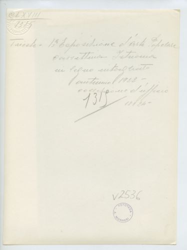 - NOTIZIE STORICO CRITICHE La fotografia fa parte dell'insieme archivistico denominato "Venezia Giulia" (tre cartelle: V. VIII, V. IX, V. X), nello specifico, è conservata all'interno della cartella V. IX. E' stata realizzata nel 1922 da Pietro Opiglia, che dal 1908 al 1947, svolse il ruolo di fotografo presso il Museo Civico triestino e del quale si serviva l'Ufficio Belle Arti della Venezia Giulia durante le proprie campagne fotografiche. In questo caso, l'Ufficio Belle Arti aveva promosso una campagna ricognitiva circa le opere d'arte presenti sul territorio transfrontaliero che oggi comprende il Friuli Venezia Giulia, la Croazia e la Slovenia. Antonio Morassi svolse il ruolo di funzionario sovrintendente presso l'Ufficio Belle Arti della Venezia Giulia dal 1920 al 1925. La fotografia fa parte di una serie realizzata durante la Prima mostra d'arte popolare italiana, che si tenne a Trieste nel 1922.