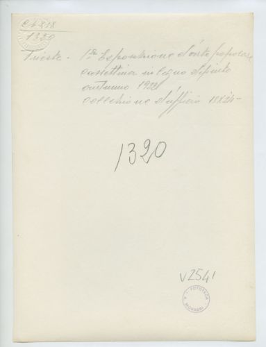 - NOTIZIE STORICO CRITICHE La fotografia fa parte dell'insieme archivistico denominato "Venezia Giulia" (tre cartelle: V. VIII, V. IX, V. X), nello specifico, è conservata all'interno della cartella V. IX. E' stata realizzata nel 1922 da Pietro Opiglia, che dal 1908 al 1947, svolse il ruolo di fotografo presso il Museo Civico triestino e del quale si serviva l'Ufficio Belle Arti della Venezia Giulia durante le proprie campagne fotografiche. In questo caso, l'Ufficio Belle Arti aveva promosso una campagna ricognitiva circa le opere d'arte presenti sul territorio transfrontaliero che oggi comprende il Friuli Venezia Giulia, la Croazia e la Slovenia. Antonio Morassi svolse il ruolo di funzionario sovrintendente presso l'Ufficio Belle Arti della Venezia Giulia dal 1920 al 1925. La fotografia fa parte di una serie realizzata durante la Prima mostra d'arte popolare italiana, che si tenne a Trieste nel 1922.