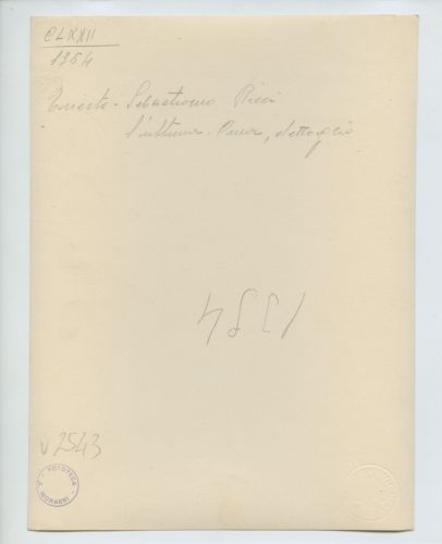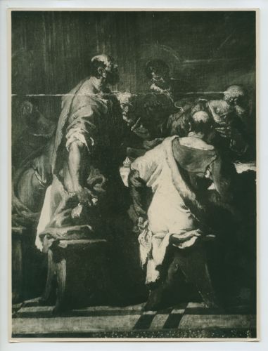 - NOTIZIE STORICO CRITICHE La fotografia fa parte dell'insieme archivistico denominato "Venezia Giulia" (tre cartelle: V. VIII, V. IX, V. X), nello specifico, è conservata all'interno della cartella V. IX. E' stata realizzata da Pietro Opiglia, che dal 1908 al 1947, svolse il ruolo di fotografo presso il Museo Civico triestino e del quale si serviva l'Ufficio Belle Arti della Venezia Giulia durante le proprie campagne fotografiche. In questo caso, l'Ufficio Belle Arti aveva promosso una campagna ricognitiva circa le opere d'arte presenti sul territorio transfrontaliero che oggi comprende il Friuli Venezia Giulia, la Croazia e la Slovenia. Antonio Morassi svolse il ruolo di funzionario sovrintendente presso l'Ufficio Belle Arti della Venezia Giulia dal 1920 al 1925. La fotografia venne scattata prima del 1924, quando il dipinto oggetto della fotografia si trovava ancora presso l'Ufficio d'esportazione di Trieste. Successivamente, il quadro venne acquistato dalle Gallerie dell'Accademia di Venezia, dove si trova ancora oggi.