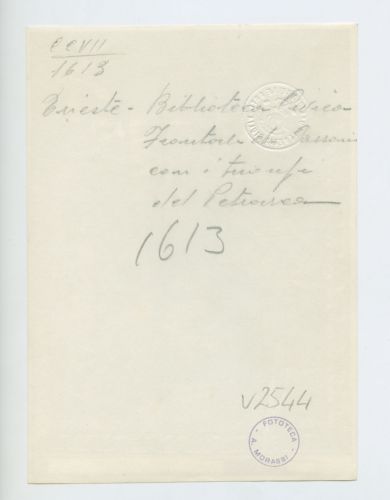 - ISCRIZIONI supporto primario: verso: a sinistra - Trieste - Biblioteca Civica/ Frontali di Cassoni/ con i trionfi/ del Petrarca - a matita -