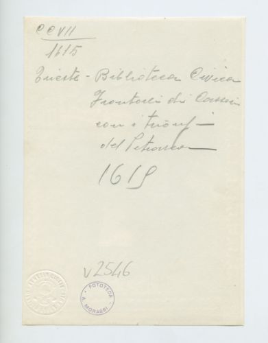 - ISCRIZIONI supporto primario: verso: a sinistra - Trieste - Biblioteca Civica/ Frontali di Cassoni/ con i trionfi del/ Petrarca - a matita -