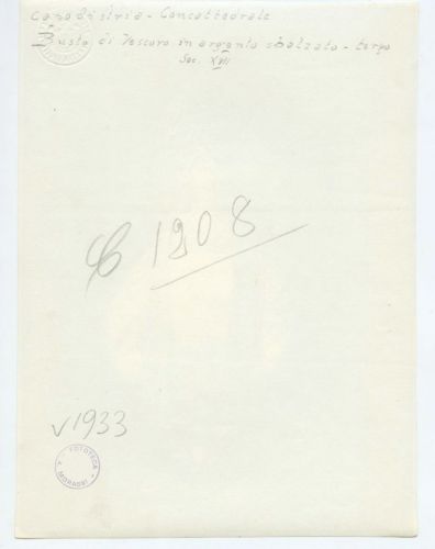 - ISCRIZIONI supporto primario: verso: in alto al centro - Capodistria - Concattedrale/ Busto di Vescovo in argento sbalzato - tergo/ Sec. XVII - a matita -