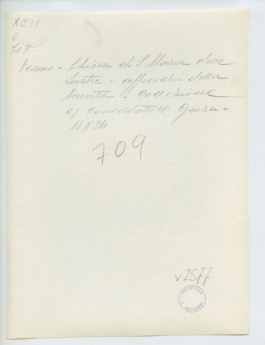 - ISCRIZIONI supporto primario: verso: in alto al centro - Vermo - Chiesa di S. Maria delle/ Lastre. affreschi della/ Navata. Collezione/ ex Conservatore Gnirs./ 18x24 - a matita -