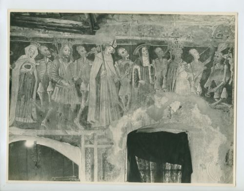 - ISCRIZIONI supporto primario: verso: a destra - Vermo - Chiesa di S. Maria delle Lastre/ Danza macabra. Collezione ex/ Conservatore Gnirs. 18x24 - a matita -