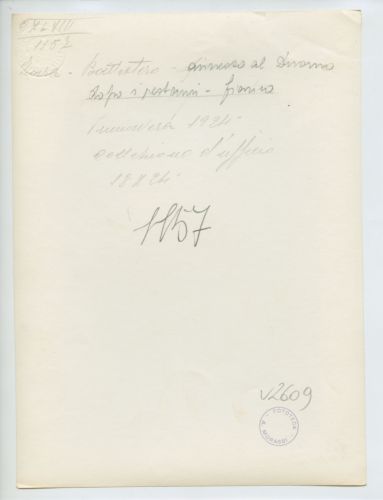 - NOTIZIE STORICO CRITICHE La fotografia fa parte dell'insieme archivistico denominato "Venezia Giulia" (tre cartelle: V. VIII, V. IX, V. X), nello specifico, è conservata all'interno della cartella V. IX. E' stata realizzata nel 1924 da Pietro Opiglia, che dal 1908 al 1947, svolse il ruolo di fotografo presso il Museo Civico triestino e del quale si serviva l'Ufficio Belle Arti della Venezia Giulia durante le proprie campagne fotografiche. In questo caso, l'Ufficio Belle Arti aveva promosso una campagna ricognitiva circa le opere d'arte presenti sul territorio transfrontaliero che oggi comprende il Friuli Venezia Giulia, la Croazia e la Slovenia. Si ricorda, inoltre, che Antonio Morassi svolse il ruolo di funzionario sovrintendente presso l'Ufficio Belle Arti della Venezia Giulia dal 1920 al 1925.