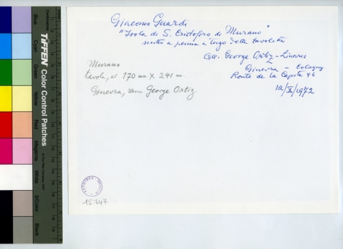 - ISCRIZIONI sul supporto primario: verso - Giacomo Guardi/ "Isola di S. Cristoforo di Murano"/ scritto a penna a tergo della tavoletta/ Coll. George Ortiz-Linares/ Ginevra - Cologny/ Ronde della Capeite 46/ 12/X/1972 - Murano/ tavola, al 170 mm x 241 mm./ Ginevra, Mons. George Ortiz - Fototeca-A. Morassi - 15.747 - Morassi, Antonio -
