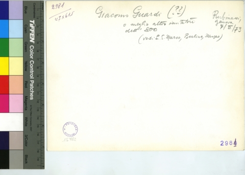 - ISCRIZIONI sul supporto primario: verso - 2981 / 47x61,5 - Giacomo Guardi (??)/ o meglio altro imitatore/ dell'800/ (vedi S. Marco, Berlino, Museo) - Rubinacci/ Genova/ 7/II/73 - 2981 - Fototeca-A. Morassi - 15.782 - Morassi, Antonio e collaboratori. Collaboratori dell'Archivio Fototeca Antonio Morassi -