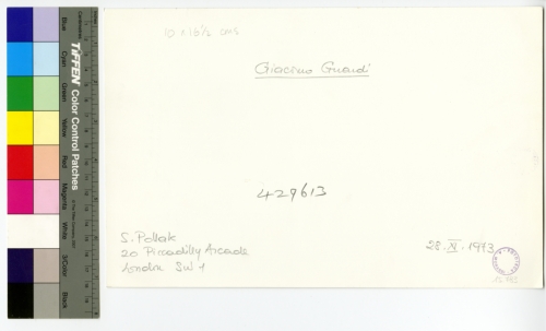 - ISCRIZIONI sul supporto primario: verso - 10x16,5 cms - Giacomo Guardi - 439613 - 28/XI/1973 - S. Pollak/ 20 Piccadilly Arcade/ Asndin sw 1 - Fototeca-A. Morassi - 15.783 - Morassi, Antonio e collaboratori. Collaboratori dell'Archivio Fototeca Antonio Morassi -