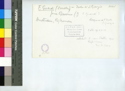 - ISCRIZIONI sul supporto primario: verso - F Guardi (Scuola)-Isola di S. Giorgio/ forse Giacomo (?) F Guardi?/ Amsterdam, Rikmuseum/ Isola di S. Giorgio/ Tela 14x21.5/ coll E. von Rath 1942 [...]/ inv A. 3403 - 2260 - Copyright/ Photo-Commissie/ Rijksmuseum/ Amsterdam - Fototeca-A. Morassi - 15.950 - Mittente. Morassi, Antonio e collaboratori. Collaboratori dell'Archivio Fototeca Antonio Morassi -