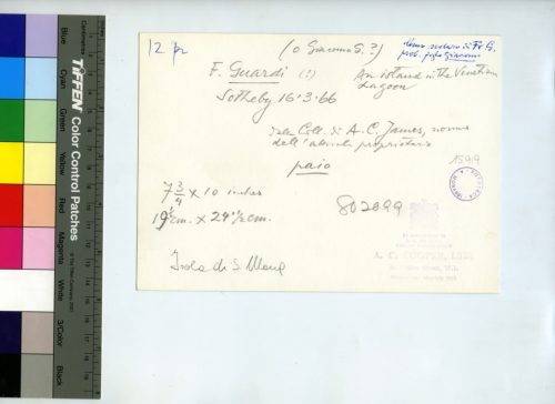 - ISCRIZIONI supporto primario: verso - 12 p. - F. Guardi/ (o Giacomo G.?)/ Sotherby 16.3.66/ della Coll. A. C. James, [...]/ dell'attuale proprietario/ paio/ 7 3/4 x 10 inches/ 19 1/2cm. x 24 1/2 cm./ Isola di S. Maria - An island in the Venetian Lagoon -[...] Fr. G. prob. foglio Giacomo - 802099 - [...] A. C. Cooper. LDT. [...] - Fototeca-A. Morassi - 15.919 - Mittente. Morassi, Antonio. Collaboratori dell'Archivio Fototeca Antonio Morassi -