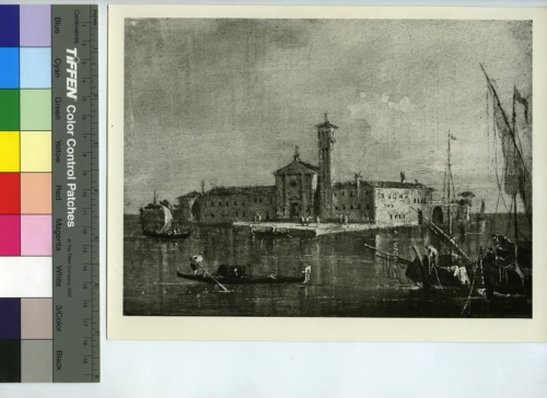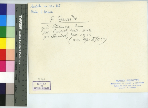- ISCRIZIONI sul supporto primario: verso - [...] cm. 23 x 16,5/ Isola S. Maria - F. Guardi/ già, Stramezzi, Crema/ già Cartutti Mil. Biella/ già Sacerdoti, Mil. 1964 / (una exp. II/1964) - Mario Perotti/ Fotografie di quadri e sculture/ Galleria [...]/ Milano-Tel. [...] - Fototeca-A. Morassi - 15.918 - Morassi, Antonio e collaboratori. Collaboratori dell'Archivio Fototeca Antonio Morassi -